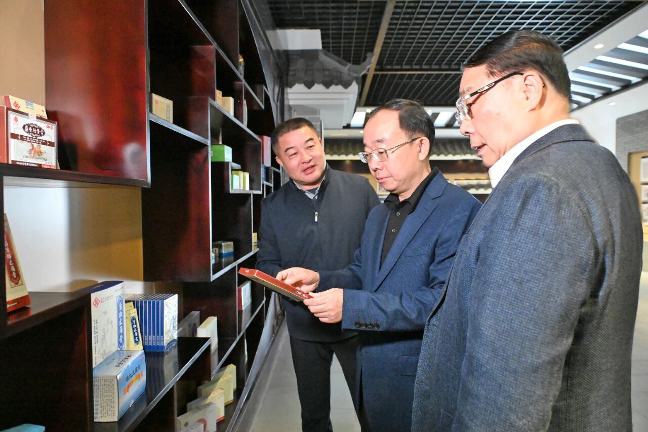 孟景伟书记一行首先参观了月博企业历史展厅,在一幅幅老照片、一件件历代产品实物与荣誉证书前驻足察看。宋礼华董事长详细介绍了企业自 1739 年创立以来的发展脉络,从传统中医药技艺的传承坚守,到融入安科生物集团后的创新突破,系统阐述了这一 “中华老字号” 近三个世纪来的历史积淀与时代价值。孟景伟不时提问,深入了解企业在不同发展阶段的核心产品、工艺特色,以及如何将家国情怀融入品牌发展,对企业深耕中医药领域、讲好安庆本土品牌故事的思路给予肯定。