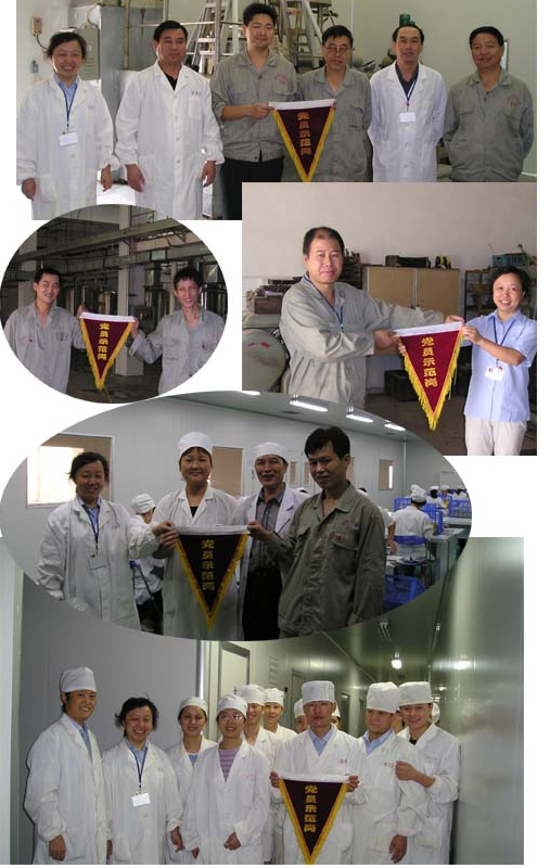 2005年9月9日上午,公司党总支副书记、总经理谢红星、副总经理方金宏等一行来到各生产车间,将一面面“党员示范岗”的旗帜分别授予了提取车间提取班组、橡胶膏车间包装班组、内服制剂车间颗粒剂班组、酊膏车间熬油班组和机动车间机修班组。鼓励广大党员要在工作中处处起模范带头作用,积极为企业的发展献计献策,充分体现出共产党员的先进性。