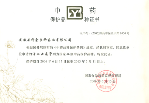 公司拳头产品——活血止痛膏在办理“国家中药保护品种”续注申请时,一次性通过审批,获得了“国家二级中药保护品种”的称号,将这一全国独家品种的保护期延长至二○一三年。