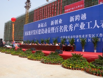 ; 在“五一”国际劳动节来临之际,安庆市经济技术开发区举办了“国家级开发区建设动员会暨百名优秀产业工人表彰会”。市委书记朱读稳、市长肖超英等党政领导纷纷到场,祝贺开发区升为国家级并寄予新的期望;同时,向获奖的优秀产业工人和先进工会组织送上节日的祝福,勉励广大产业工人和基层工会组织在新形式下要不断学习,为企业、社会做出更大的贡献。我公司近三十名员工组成方阵参加了活动,段黄根、张宏两名获“优秀产业工人”称号的员工受到了表彰。