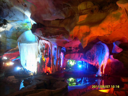 旅游首站为著名景点蓬莱仙洞。仙洞果然名不虚传,刚站立洞口,便觉凉意阵阵,使人惬然。迫不及待进洞后,如同到了神话剧中的仙人迷宫。洞内各种奇特的自然景观叫人目不暇接。在灯光的投射下,洞内的钟乳石群更是遍布呈现出五光十色、绚烂多彩的壮丽奇观。