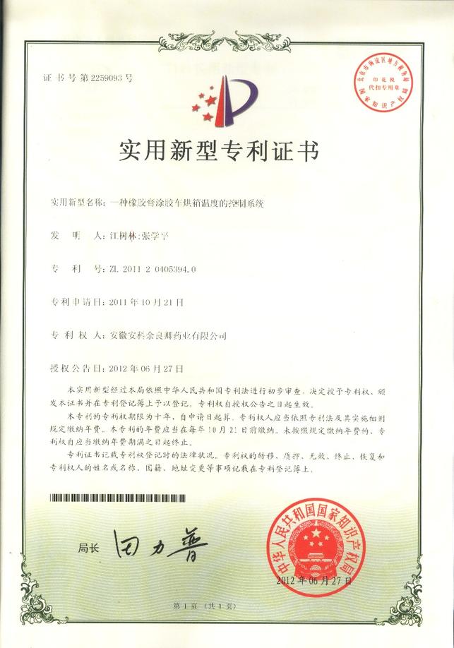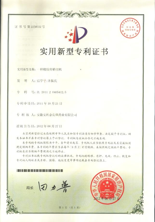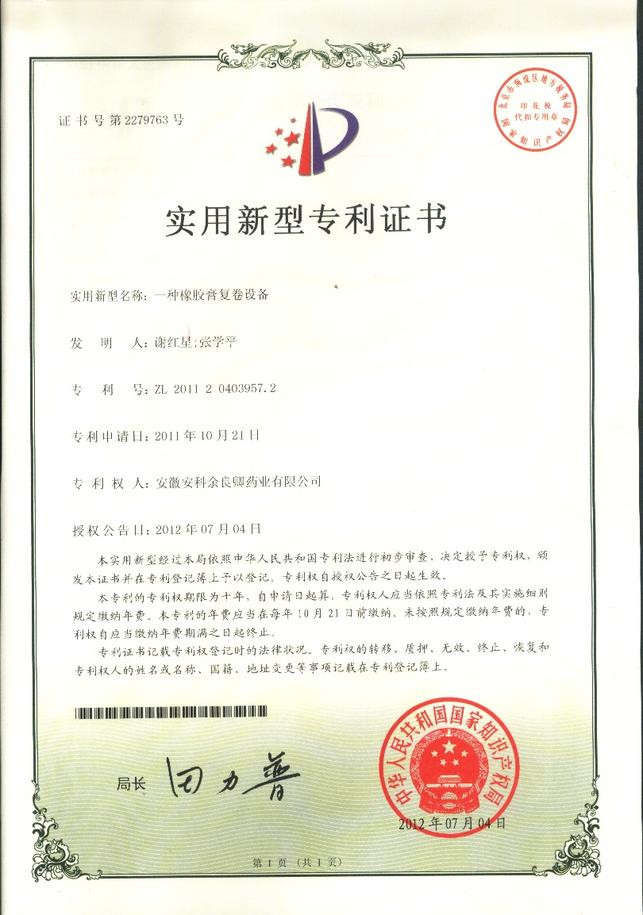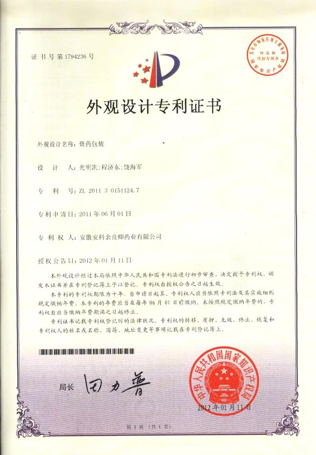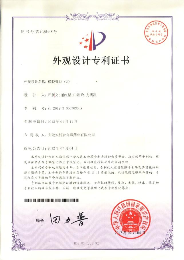 为加强科技创新和知识产权保护,提升企业核心竞争力,2011年,公司共提交六项专利申请,分别为“一种膏药”、 “一种膏药制作设备”、“一种橡胶膏涂胶车烘箱温度的控制系统”、“一种橡胶膏横切机”、“一种橡胶膏复卷设备”和“一种药液灌装设备”。自今年3月份开始,已陆续获得国家知识产权局授予的实用新型专利证书。另有两项外观设计专利也已获得证书。
