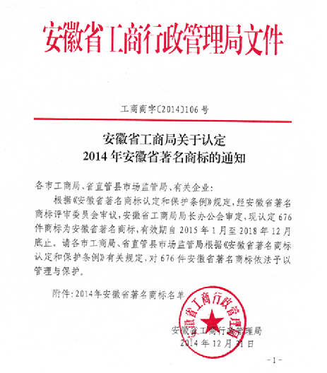 根据《安徽省工商局关于认定2014年安徽省著名商标的通知》(工商商字[2014]106号),我公司注册商标“月博号”被认定为安徽省著名商标,有效期自2015年1月至2018年12月底止。