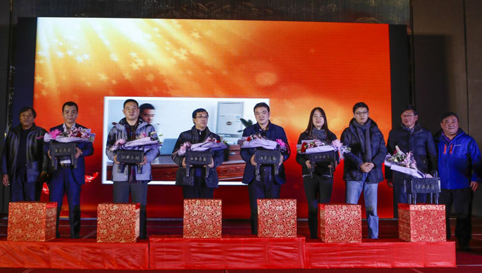 余达谟先生的儿子余灿先生首先代表父亲上台接受赠篇。他为月博发展到今天的景象感到无比的欣慰。并祝愿安科月博在未来发展得越来越好,将月博号永远的传承下去,发扬光大。