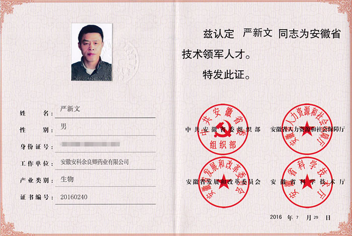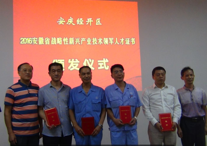 9月1日下午,安庆经开区“2016年度安徽省战略性新兴产业技术领军人才”证书颁发仪式在我公司五楼会议室隆重举行。
